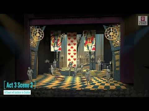 The foundation of the world is a Victorian inspired place with decaying iron buttressing evoking Leontes’ descent into jealousy and madness contrasted with elegant sheer gold curtains to provide layering, softening, and the grandeur expected of a royal palace. A multi-level platform with numerous entrances, steps, railings, and a ramped upstage entrance allows for varied staging and imaginative use location to location. Furthermore, multiple oversized clocks (representing Time) and a forced perspective checkered tiled floor adds allusions to “Alice in Wonderland” and the whimsy encountered in Bohemia.